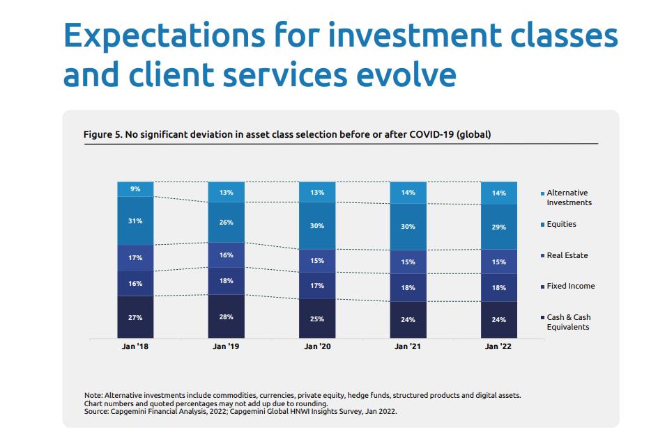 然而,根据凯捷的调查,尽管疫情导致全球市场发生动荡,但在过去几年中,高净值人士的资产配置并未发生显着变化。新冠对2021年全球高净值人士资产类别选择的影响微乎其微。