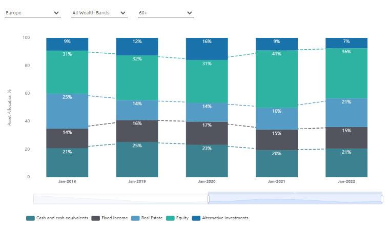 此外,不同地区、不同年龄的投资类别也有所不同。比如,在欧洲,相比60岁以下人群,60岁以上人群在房产方面的投资份额更高,达到了21%。