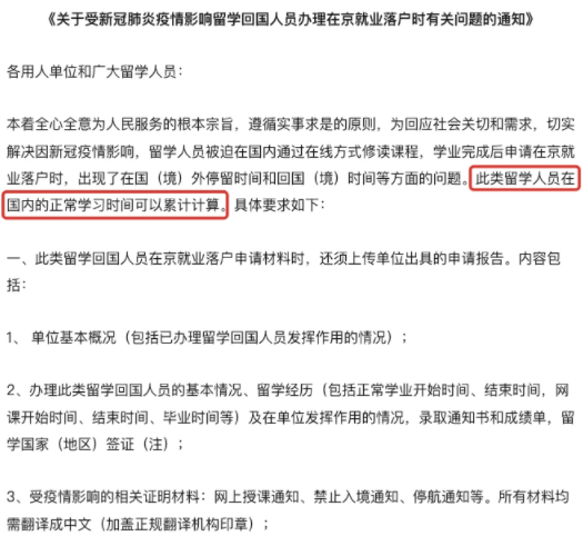 - 教育部留学服务中心发布通知:留学生落户北京要求再次放宽,取消回国2年落户限制,上网课也行!