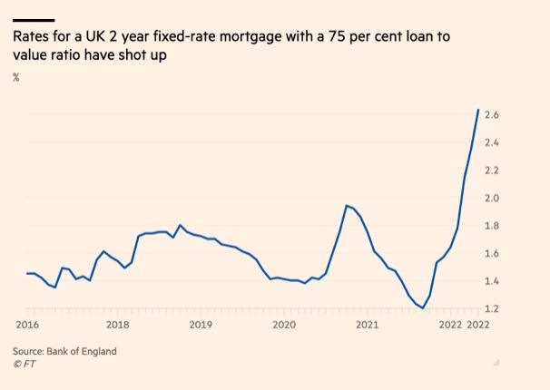 两年期固定利率抵押贷款的平均利率,从8个月前的低点1.2%飙升至2.63%——这是自1995年有记录以来的最快增幅。现有抵押贷款利率也上升了2个基点,至2.07%。