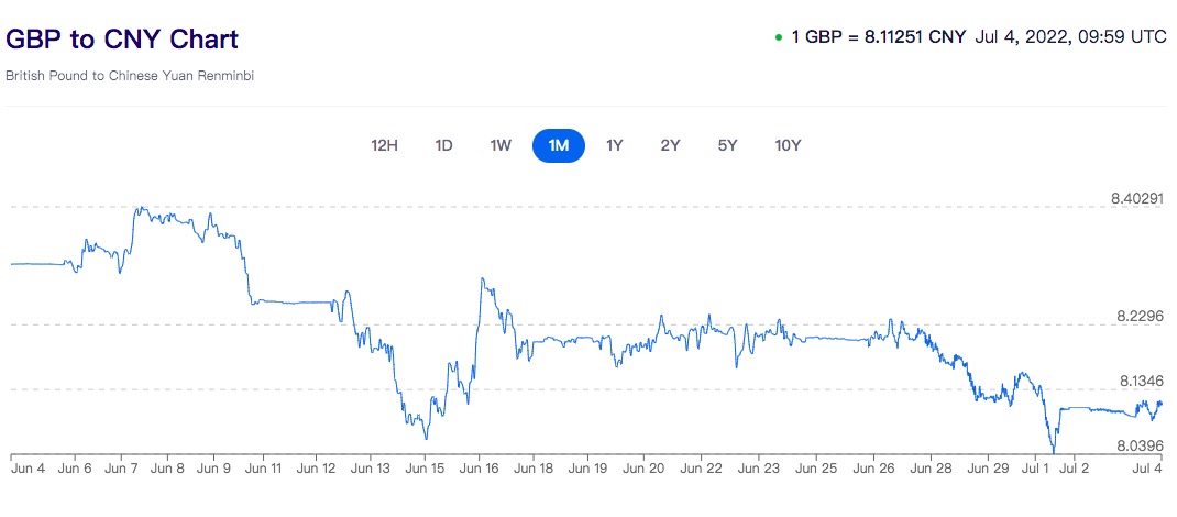 - 受通货膨胀、全球经济形势严峻及苏格兰独立公投等影响,英镑跌至1 GBP = 8.11251 CNY