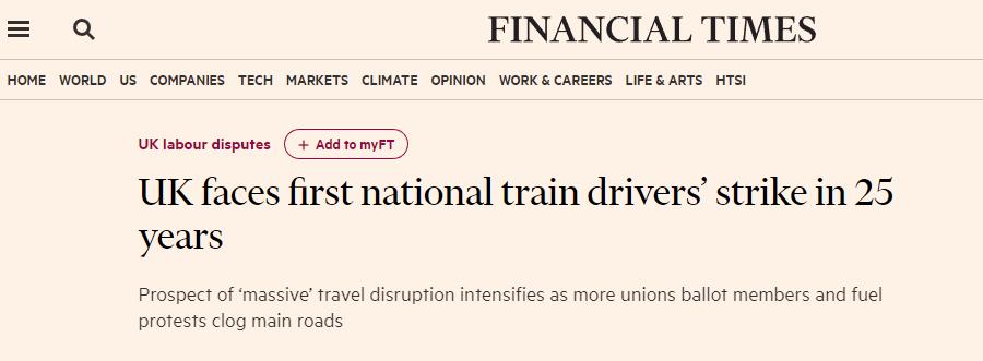 媒体表示,整个行业接连的罢工行动将加剧交通网络的混乱,这也意味着英国人不得不面对一个交通中断的夏天。