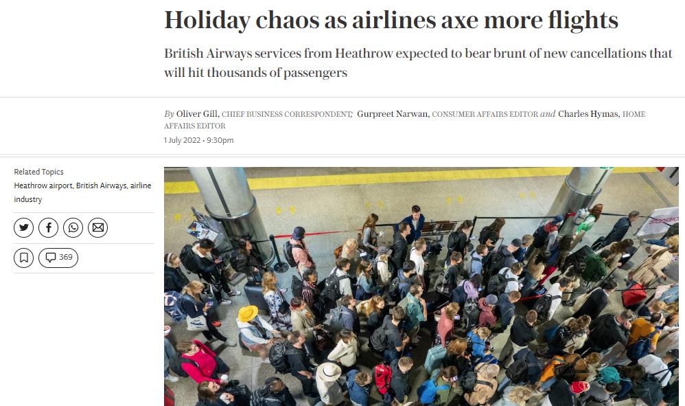 根据航空业数据,易捷航空在6月份取消了742趟航班,而英国航空取消了295趟航班。