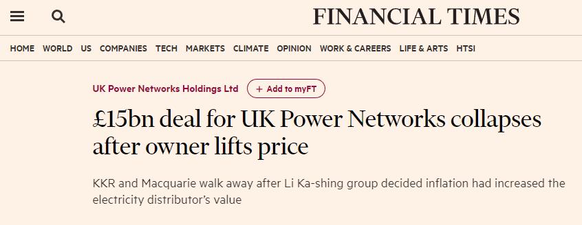 认为交易价格过低,李嘉诚家族拒售英国电力公司,KKR财团以150亿英镑收购英国最大电力公司UK Power Networks的计划最终以失败告终…