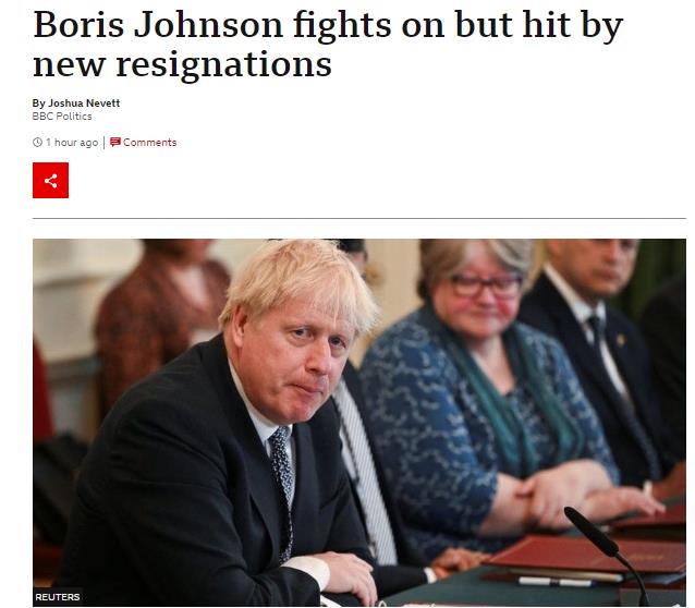 在贾维德和苏纳克辞职消息传出后,有多名政府官员紧随其后,宣布辞去职位…