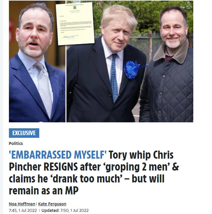 就在6月底,身居高位的克里斯托弗·平彻被媒体曝出在伦敦一家俱乐部对两名男子进行性骚扰。迫于舆论压力,他于6月30日辞职。