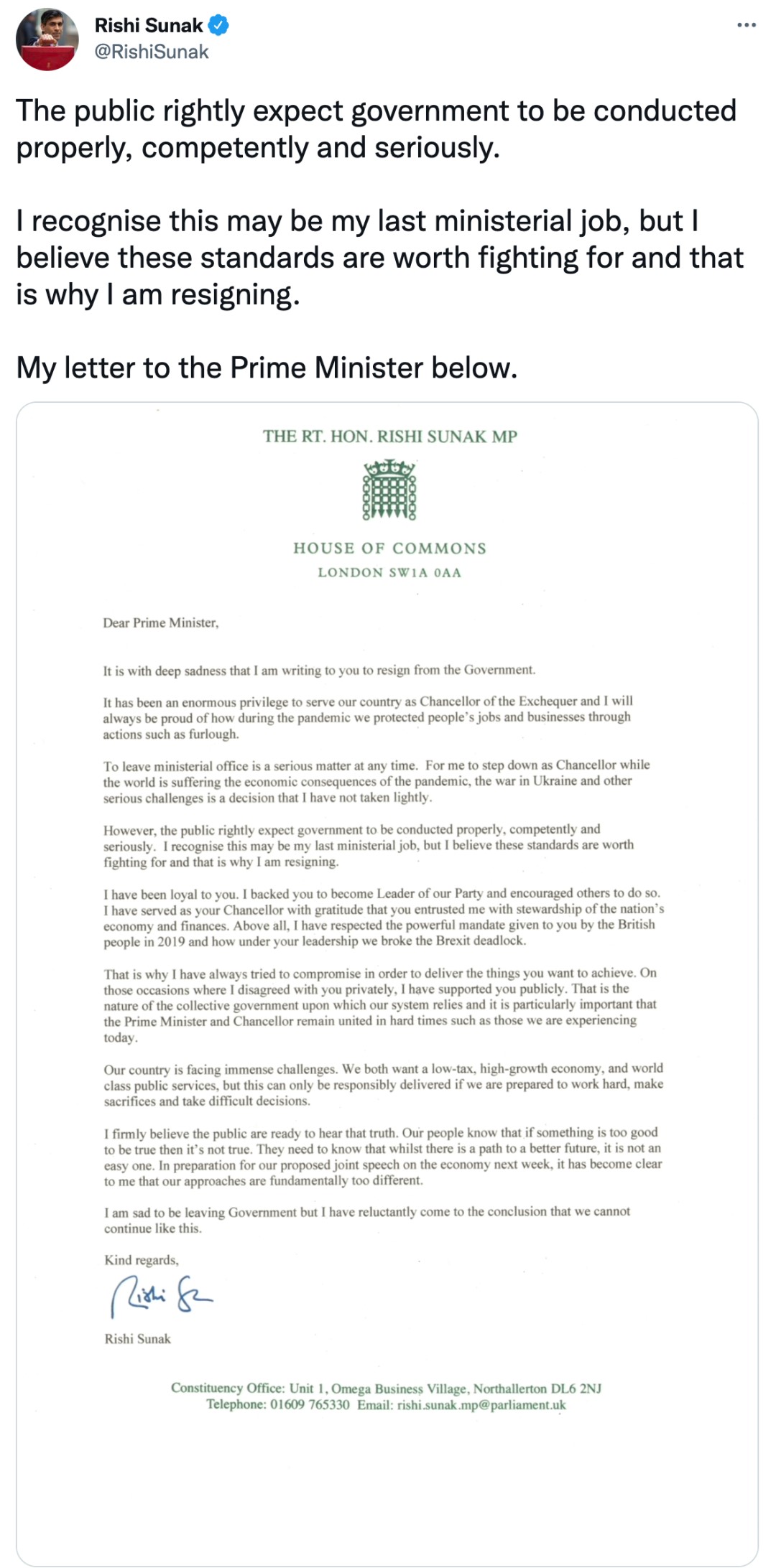 苏纳克表示:“我们的国家面临着巨大的挑战,公众期望政府能够正确、称职和认真地管理国家。我相信这些标准值得为之奋斗,这就是我辞职的原因。”