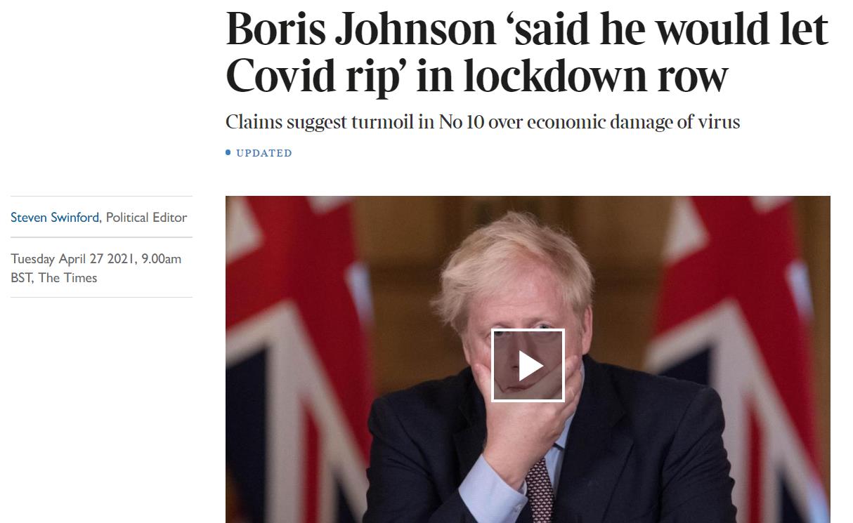 这一爆炸性言论立即引发了轩然大波,随后,有媒体撰文称,鲍里斯在封锁期间曾多次发表了要对疫情“放任不管”的言论,并曾告诉助手,宁愿让新冠“撕裂”英国,也不要施加另一次封锁。