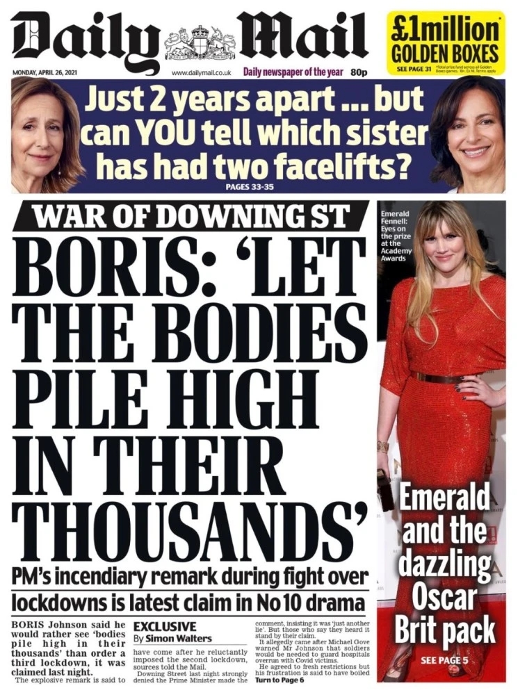 去年年初,有媒体爆料称,鲍里斯在2020年10月的一次唐宁街会议中发表骇人言论,刚刚同意进行第二次全国性封锁的他愤怒表示:“我宁愿看到成千上万的尸体堆积如山,也不要再一次实施封锁。”