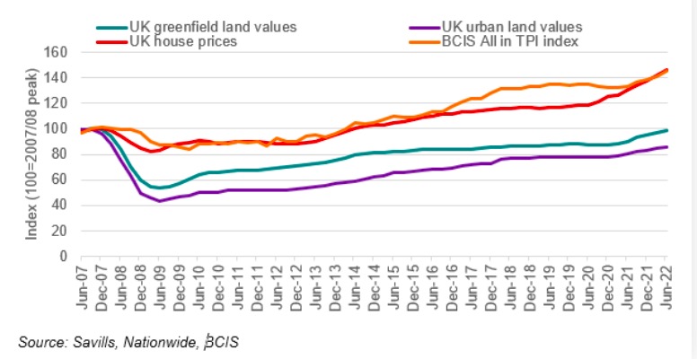 住房的激烈需求推高了英国的土地价值。Greenfield和Urban土地的价格去年上涨了9.7%和7.1%。第二季度分别上升了2%和1.7%