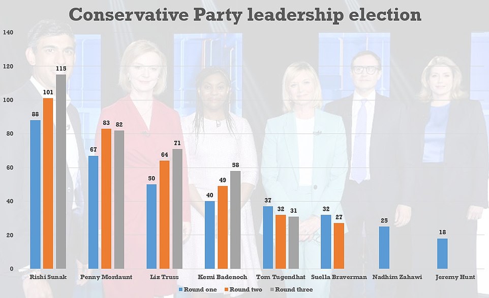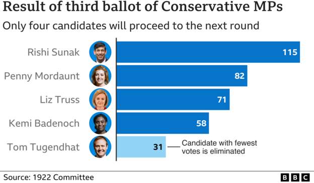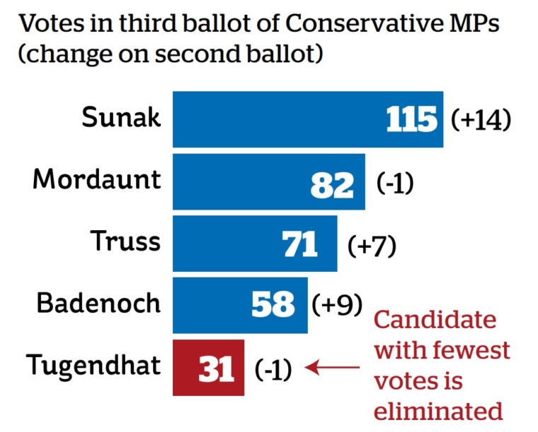 昨天的三轮投票中,票数最低的候选人Tom Tugendhat被淘汰,Rishi Sunak稳坐第一名。