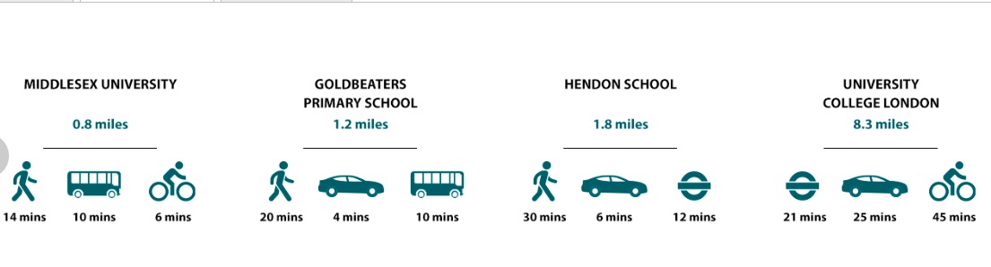 步行可以抵达Middlesex大学、Goldbeaters小学、Hendon School等。地铁21分钟抵达University College London。