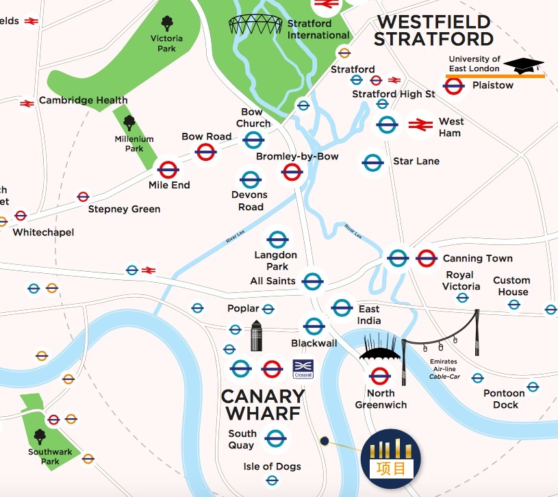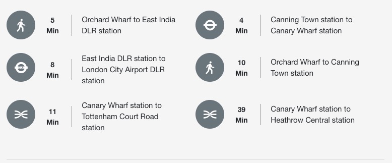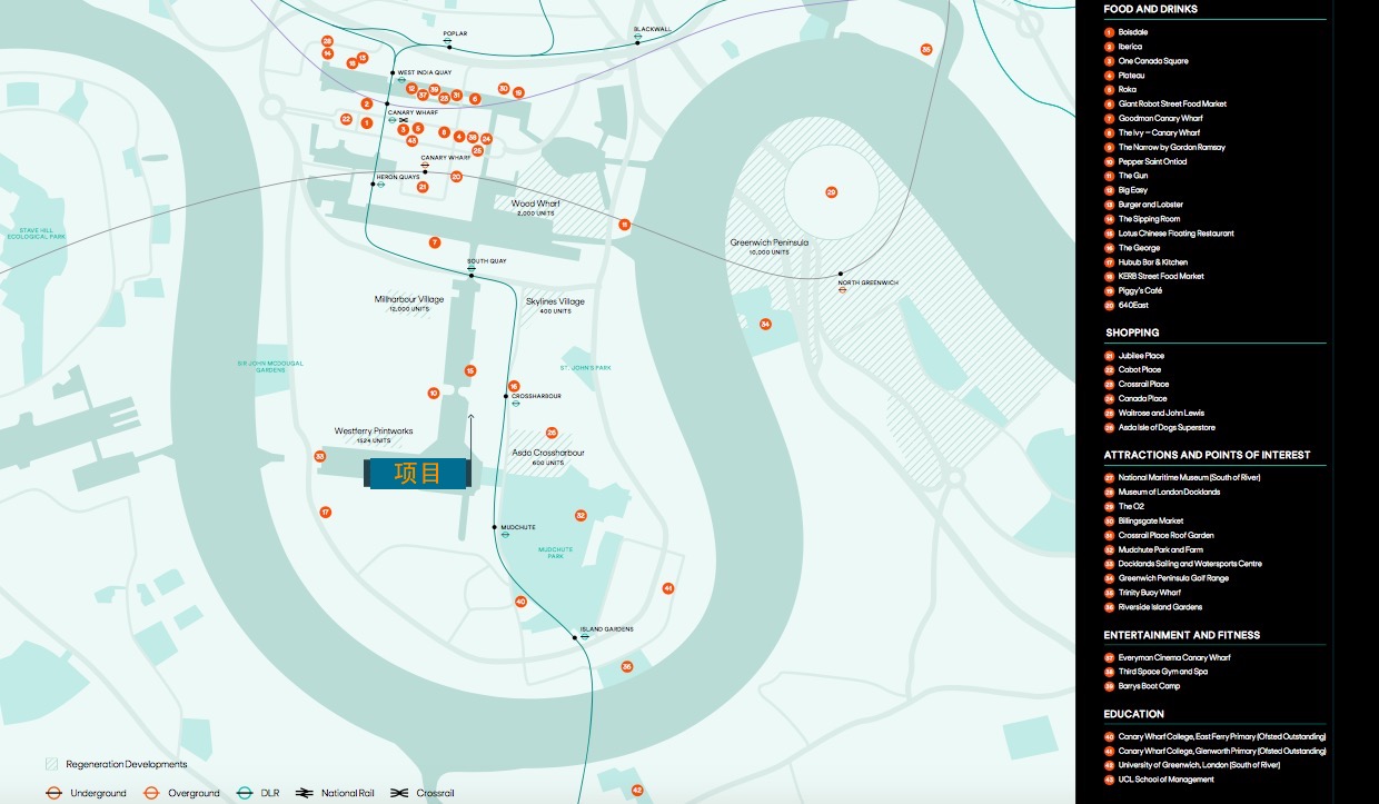 从项目步行约一分钟即达DLR站,转乘伊丽莎白线约13分钟至金丝雀码头、约22分钟至老金融城。