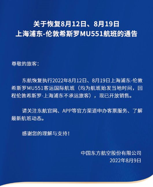 东航发布公告,恢复执行2022年8月12日、8月19日上海浦东-伦敦希斯罗MU551客运国际航班(均为航班始发当地时间,回程伦敦希斯罗-上海浦东不承运旅客),现已开放销售。