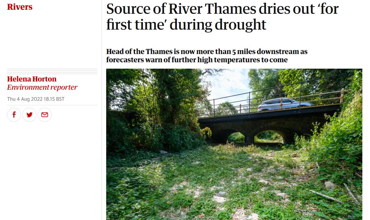 今年7月,英格兰更是迎来了自1935年以来最干燥的7月,多地面临严重旱灾,就连被称为英国“母亲河”的泰晤士河,其源头也出现了有史以来的第一次干涸。