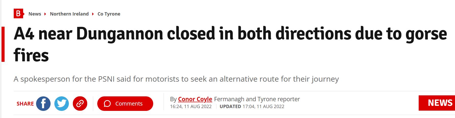 在Cornwall,消防员正在处理多日来的第二场大火,Truro外有许多田野和树篱着火。而在Tyrone,由于路边的金雀花大火,Dungannon和Ballygawley之间的A4公路被迫关闭。