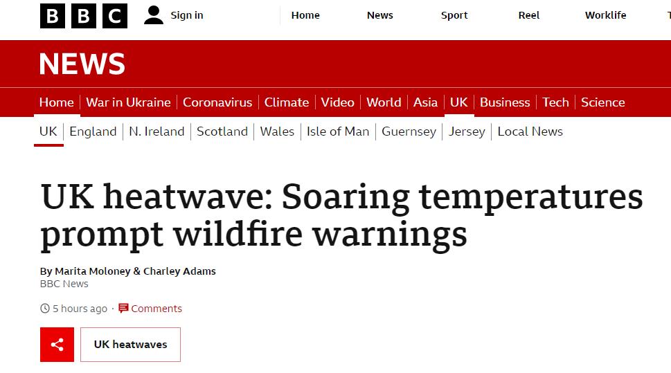 英国气象局琥珀色极端高温预警已经生效,并同步发布火灾风险最高级别警报,英国已有多地出现火灾…