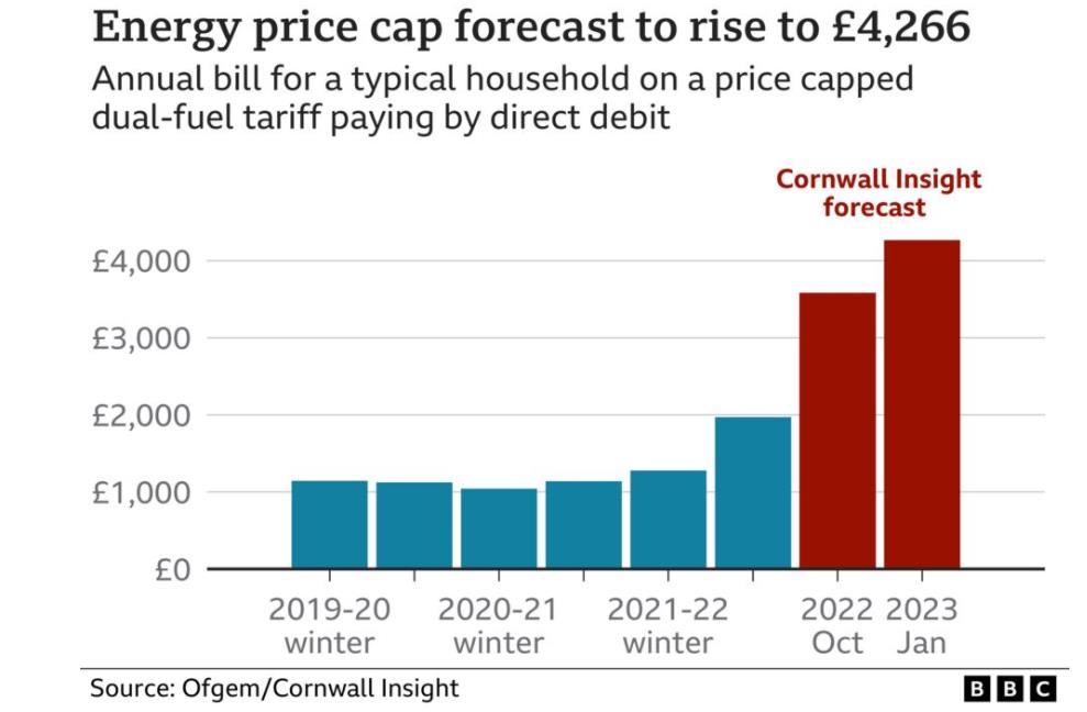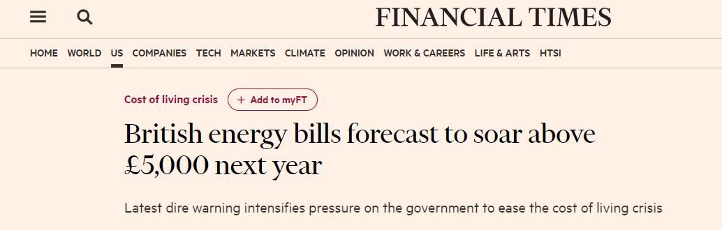 而其他预测显示,明年上半年,英国家庭的年度能源账单还可能会进一步飙升至5,000英镑以上。