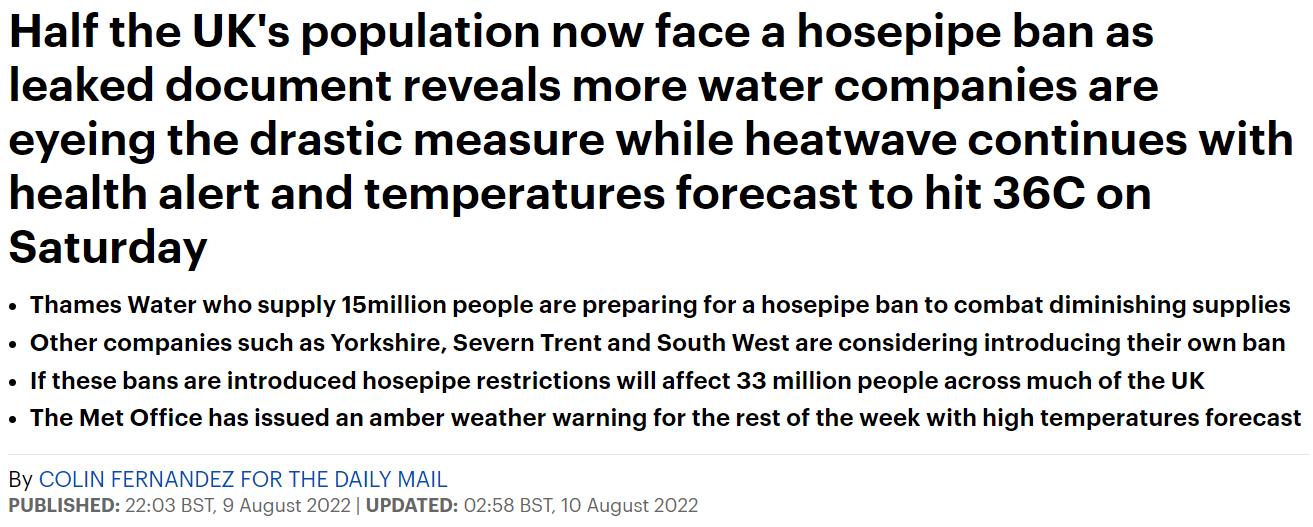 就在本周,为包括伦敦在内的地区服务的ThamesWater也宣布将“在未来几周内”实施软管禁令。