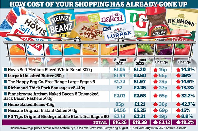 除了能源,食品等家庭杂货价格账单也上涨了500镑以上。其中牛奶和黄油等上涨了25%和23.5%。