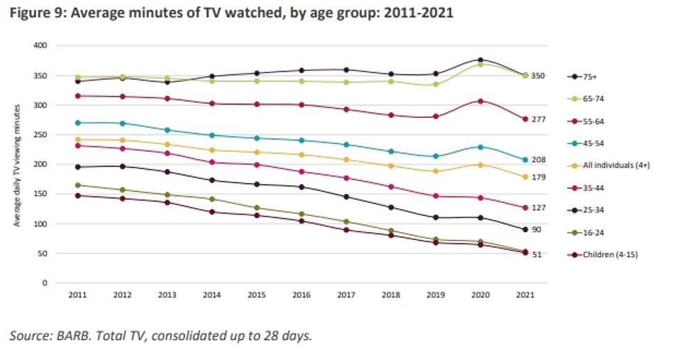 相比之下,65岁以上人群每天收看电视的时间为5小时50分钟,比10年前略有上升。