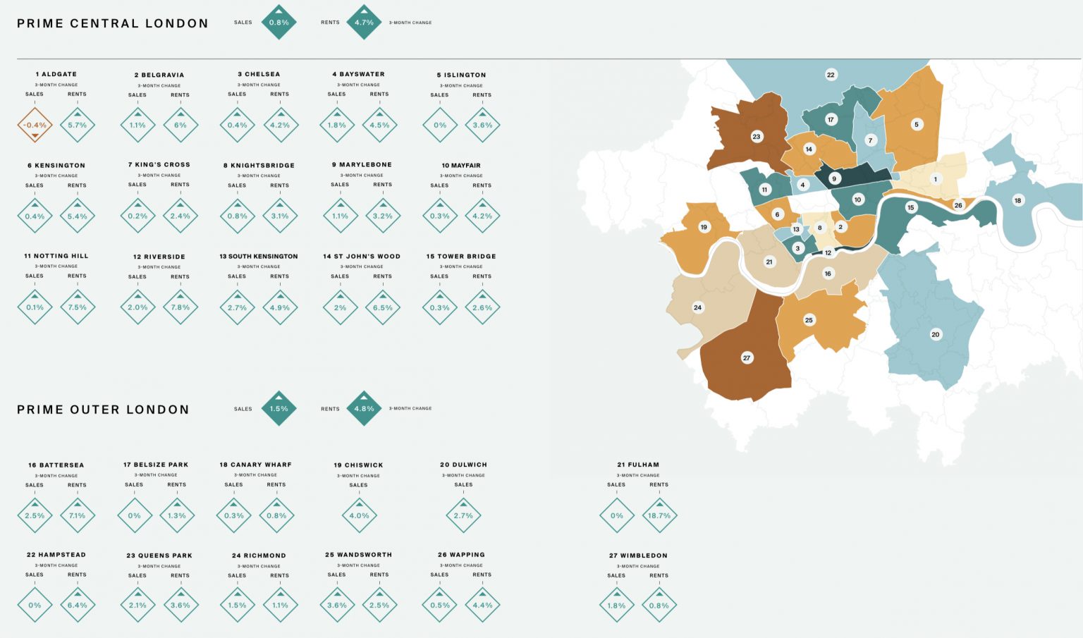 Knight Frank数据显示:伦敦黄金地段房产房价和租金全面上升。
