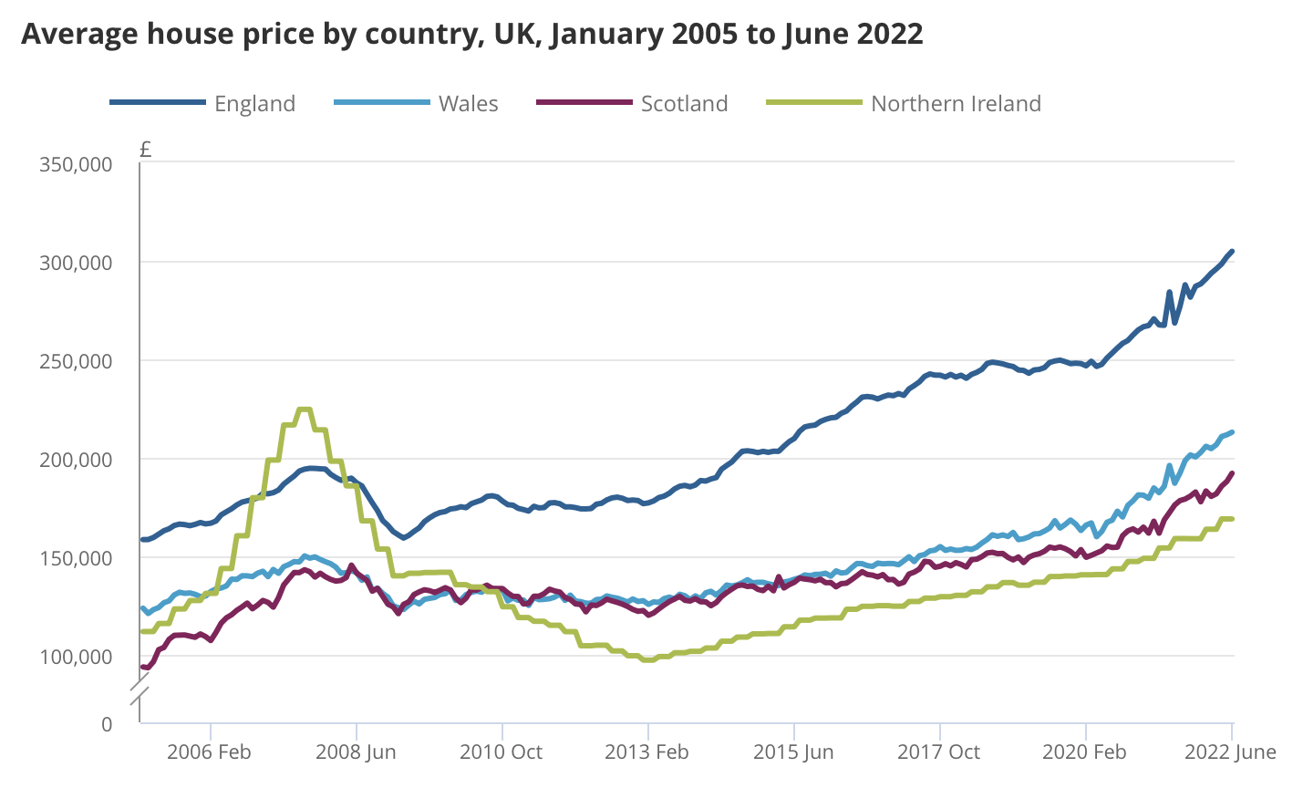 其中,2022年5月至6月,英格兰房价平均上涨0.9%。每年7.3%的价格上涨使得平均房产价值达到304,867英镑。