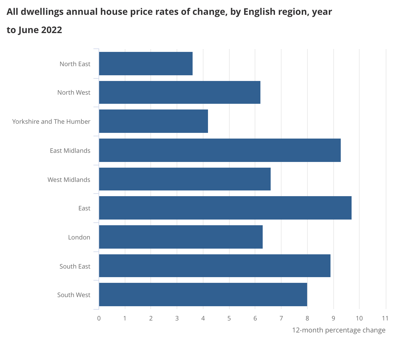 在过去的12个月里,英格兰东部的平均房价涨幅最大,为9.7%。