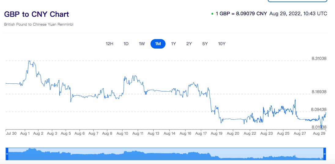 英镑汇率下降,兑换人民币:1 GBP = 8.09079 CNY