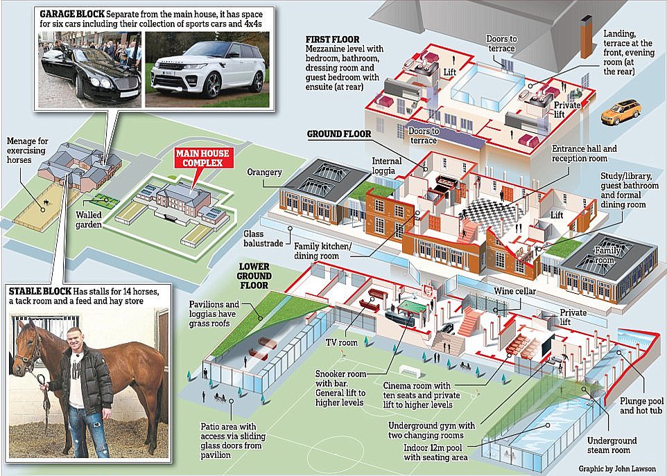 2006年,鲁尼以150万镑的价格在柴郡买下了一片地,并将原有的老旧建筑拆除,建造了一套6室豪宅,配有私人影院、按摩浴缸和泳池……