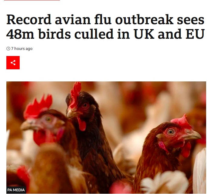 - 创记录的禽流感爆发导致英国和欧盟4,800万只家禽被扑杀。
