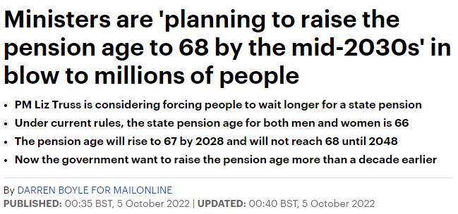 据媒体报道,英国新任首相特拉斯正在考虑延迟退休金发放年龄,在2030年代中期将领取国家养老金的年龄大幅提高到68岁,比现行政策提前了十多年。