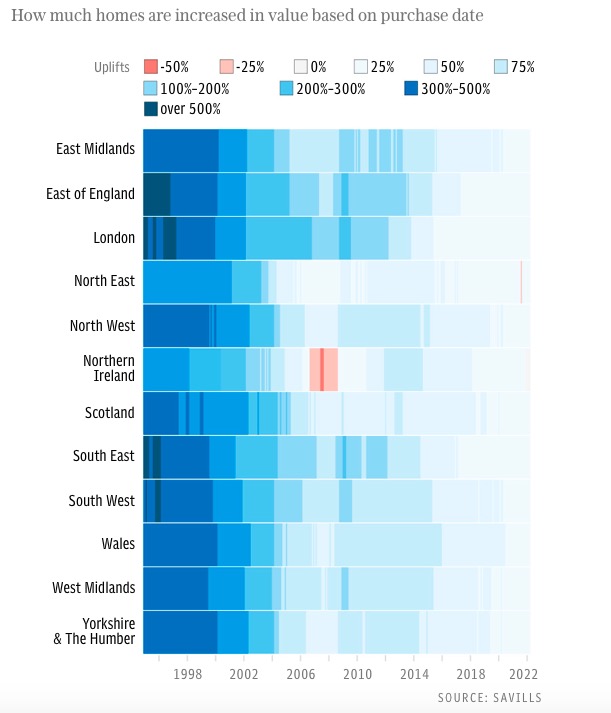 今年迄今为止,在英格兰和威尔士出售房屋的卖家中,五分之一的房产卖家跟当初的购买价格比翻了一番。
