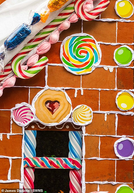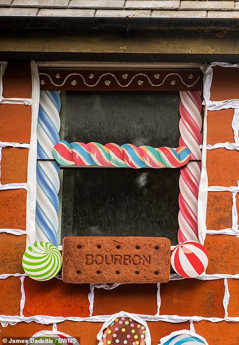 模仿姜糖屋的砖块是由防水的纤维板制成,巧克力使用旧牛奶盒子经过加工后制成。