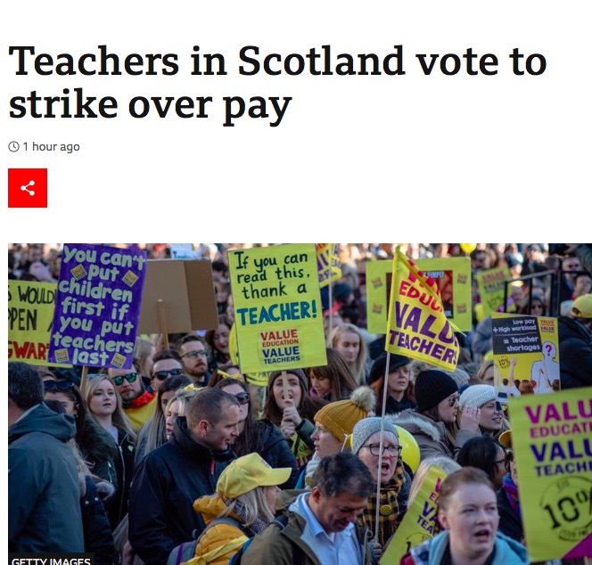 - 苏格兰最大的教师工会表示:苏格兰教师以压倒性多数投票同意就工资纠纷举行罢工。