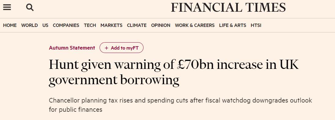 据媒体报道,在即将公布的秋季声明中,亨特将宣布削减约350亿英镑的公共开支,并计划筹集200亿英镑的税收。