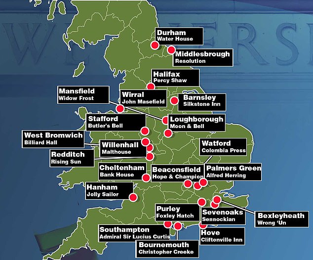 现在面临关闭的酒吧包括 Holloway 的 Coronet、Peebles 的 Cross Keys、Crediton 的 General Sir Redvers Buller、Fareham 的 Lord Arthur Lee、Hammersmith 的 Plough & Harrow、Fraserburgh 的 Saltoun Inn 和德比的 Thomas Leaper。