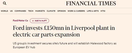 - 福特公司将向位于利物浦的Halewood工厂投资5亿英镑,以扩大电动汽车零部件的生产…