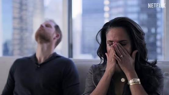 在视频中,还出现了哈里严肃地画外音,他说:“没人看到关着的门后面发生了什么”。而此时,梅根正坐在旁边的扶手椅上,看起来像在掩面哭泣。