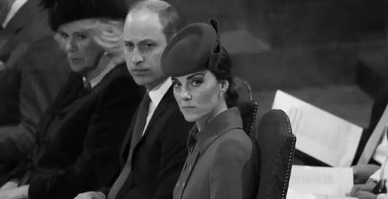 随后,影片立即切换到威廉和凯特在2019年伦敦英联邦服务仪式上的一个镜头,两人面容憔悴,哈里和梅根则温顺地坐在他们身后。