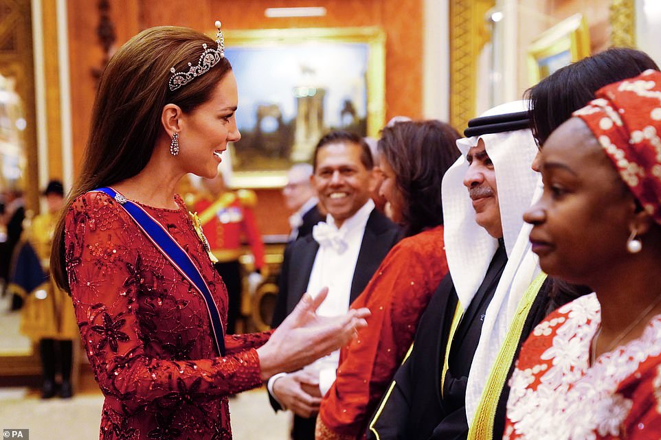 英国当地时间昨晚,凯特王妃一身红裙惊艳亮相在白金汉宫举行的外交使团招待会。