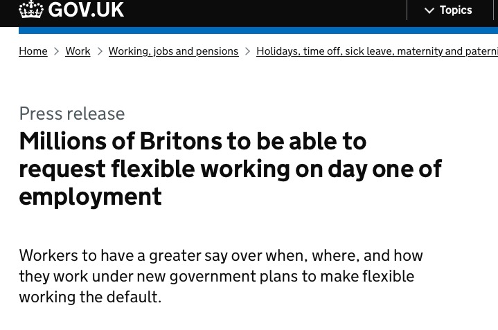 - 根据英国政府的弹性工作制新规:数以百万计的英国员工在就业的第一天就可以要求灵活的工作时间和地点,而企业将从更高的生产效率中受益。