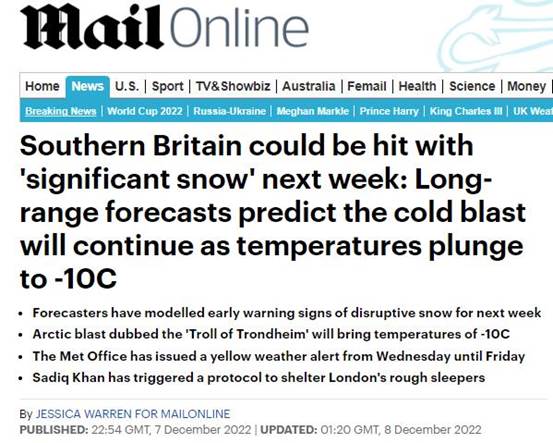 英国气象局警告称,由于极强寒流的来袭,英国下周可能会遭遇“大雪”,且最低气温将低于-10摄氏度。