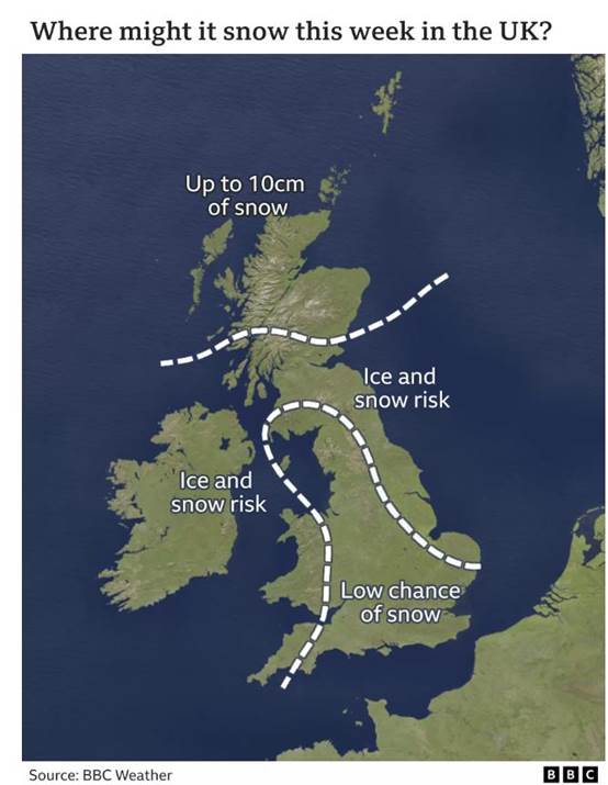 - 英国气象局警告称,由于极强寒流的来袭,英国下周可能会遭遇“大雪”,且最低气温将低于-10摄氏度…