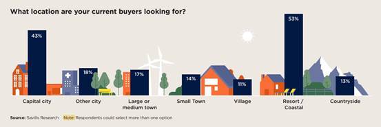 Savills表示,尽管距离新冠疫情爆发已经过去了三年,但疫情带来的趋势变化仍旧存在,目前,平均有三分之二的买家在寻找度假胜地、沿海或乡村地区的房产,这表明对空间的寻找仍在继续。