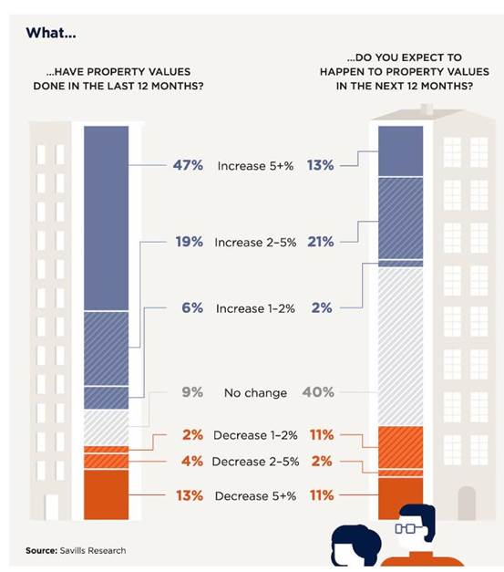 66%的受访者表示,去年他们所在市场的房地产价值增长了2%以上,近50%的受访者表示,他们所在市场的房地产价值增长了5%以上。