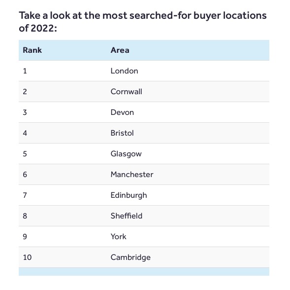 Rightmove总结了2022年购房搜索量最大的英国地区,伦敦位居榜首,康沃尔、德文郡、布里斯托尔、格拉斯哥和曼彻斯特等名列前茅。