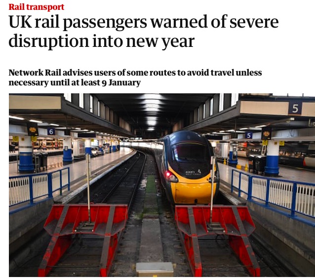 - 英国铁路警告称:新年将出现严重的交通中断,乘客在1月9日之前,非必要 ,不要乘坐火车出行。