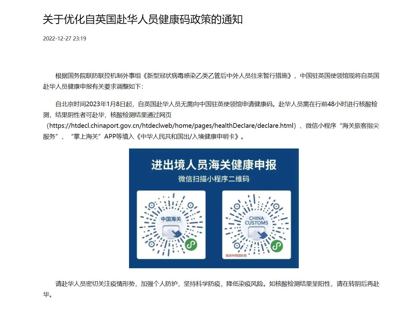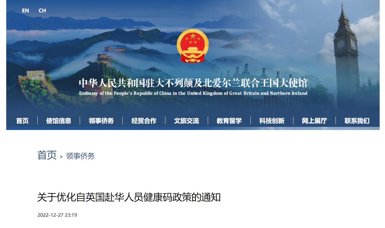当地时间12月27日,中国驻英大使馆发布重要通知,将根据国务院联防联控机制外事组的《新型冠状病毒感染乙类乙管后中外人员往来暂行措施》,对自英国赴华人员健康申报的要求进行调整。