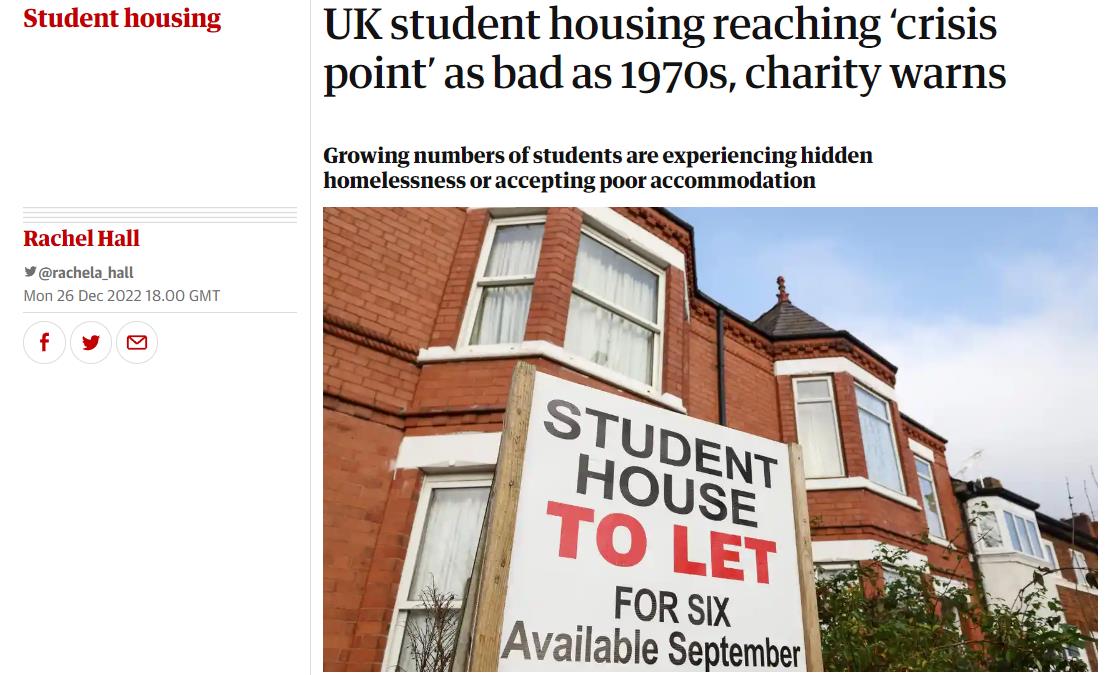 - Unipol近日发出警告称,英国的学生宿舍严重短缺,正达到自上世纪70年代以来从未出现过的“危机点”,而在新的一年里,这种情况将进一步恶化,很多学生或面临无房可住…